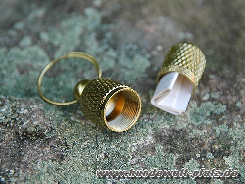 Dieser kleine Anhänger aus Metall enthält einen kleinen Zettel mit Name und Adresse des Hundehalters.