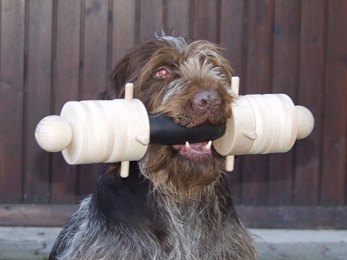 Dieser revolutionäre Apportierbock ist ähnlich aufgebaut, wie eine Hantel. Auf einer Gewindestange können Holz- oder Metallscheiben aufgesteckt werden. Zwei breite Schreiben sind mit je 4 Dübeln versehen, die das Wegrollen verhinden. Das Mittelteil besteht aus einem Grunddummy (bissfester Hartschaum). Die Enden werden nicht mit Flügelmuttern verschlossen, sondern mit Holzkugeln. Dadurch entsteht keine Verletzungsgefahr.