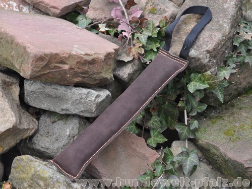 Beißwurst aus stabilem Chromleder, weich gepolstert. Mit einer eingenähten Handschlaufe.