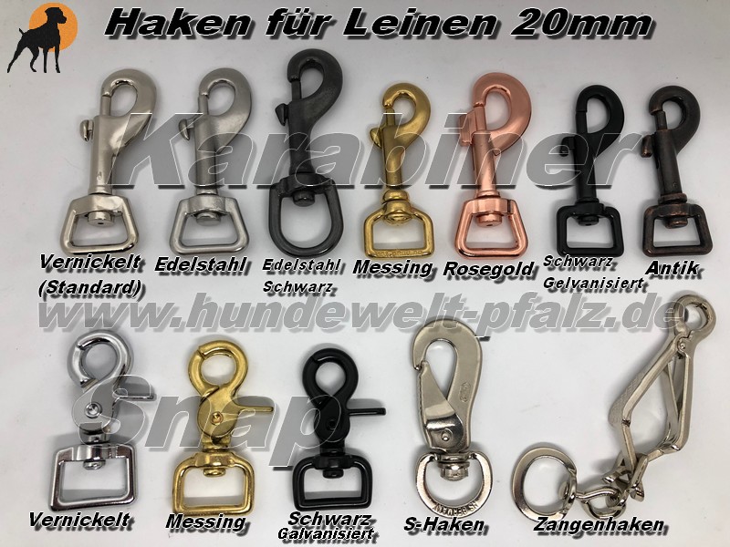 Beschläge: Standard Ausführung mit vernickeltem Karabinerhaken - weitere Haken gegen Aufpreis