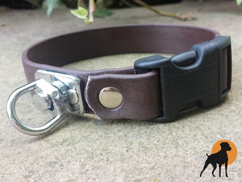 Beginnen Sie mit der Schweißarbeit gleich mit einer richtigen Halsung mit Wirbel. Für einen angenehmen Tragekomfort wurden die vernieteten Enden nach außen umgeschlagen. Durch das weiche Material sitzt diese Halsung sehr angenehm. Paßgenau durch Maßanfertigung. Mit dem PVC Marken-Klickverschluß ist die Halsung schnell angelegt bzw. der Hund rasch gechnallt.