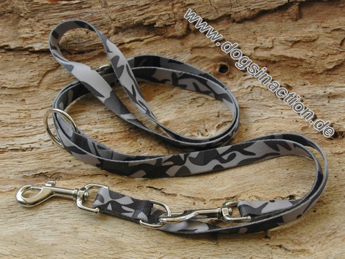 Doppelführleine in Camouflage "Urban" besteht aus hochwertigem bedrucktem Nylongewebe. Wem das "normale" Camouflage zu grün ist, der findet hier eine trendige Alternative in schwarz/grau Tönen.