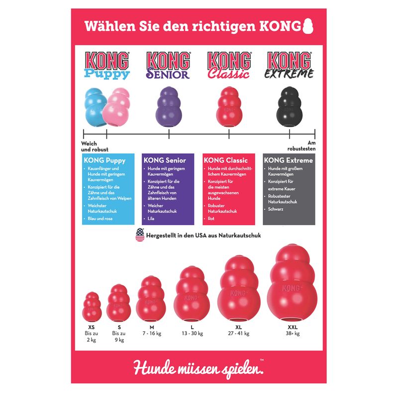 Wer kennt nicht, den berühmten KONG Classic aus absolut unübertroffen bissfestem Material, von Tierärzten empfohlen. Er kullert und springt und lässt sich mit Futter füllen. Immer wieder wird versucht, den KONG Classic zu imitieren. Bisher erfolglos! Die Mischung dieses Naturkautschuks ist unübertroffen. Eine Nachahmung zerlegt der Hund in Windeseile und hoffentlich, abgesehen mal vom Geld, muss dann nicht auch noch der Tierarzt aufgesucht werden.