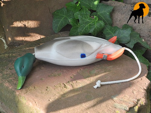 Der frei schwingende Kopf und der Schwanz sind aus Hart-Plastik, während der Korpus aus einem weicheren geschäumten Kunststoff besteht. Dies bewirkt, dass es der Hund bevorzugen wird, die Ente weich und sicher zu tragen. Natürlich ist dieses Dummy auch schwimmfähig (unsinkbar).