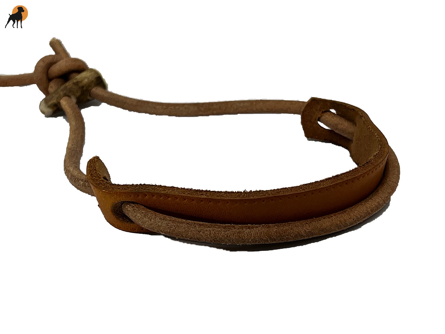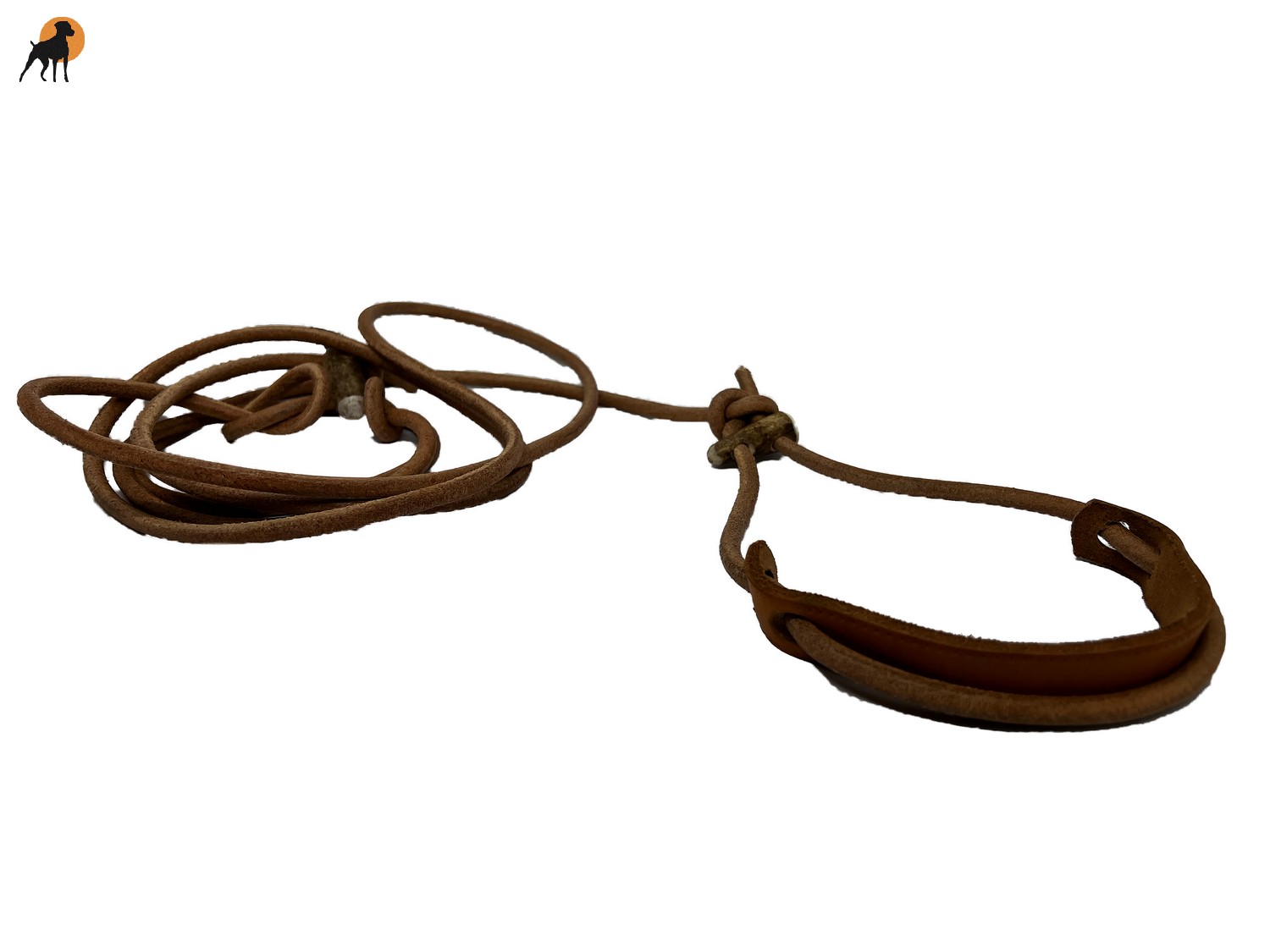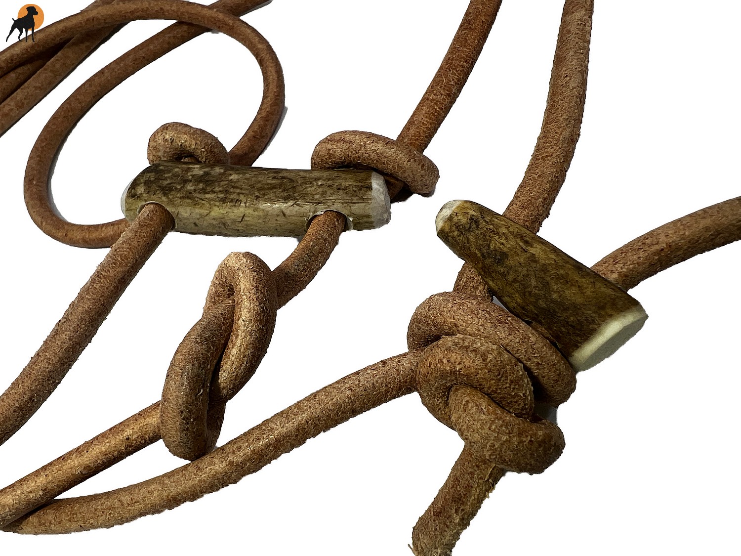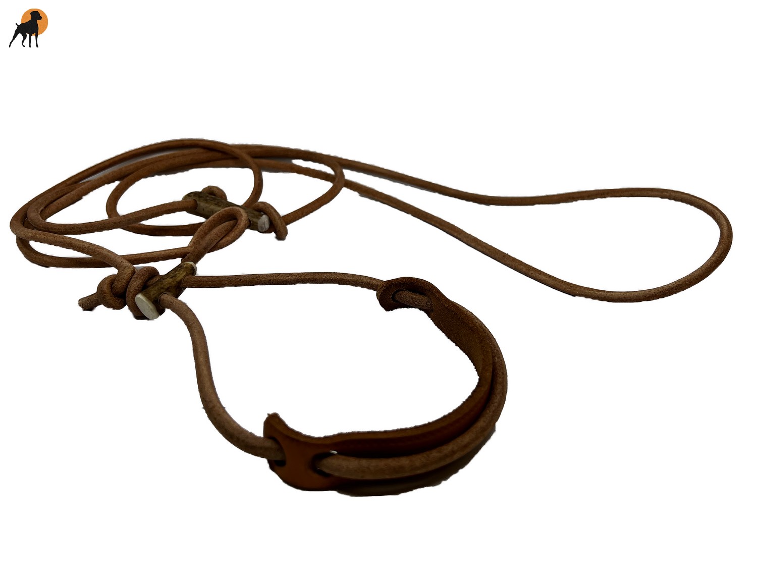 Pirschleine aus 6mm Rundleder mit 2 Hornknebel und Kehlkopfschutz.