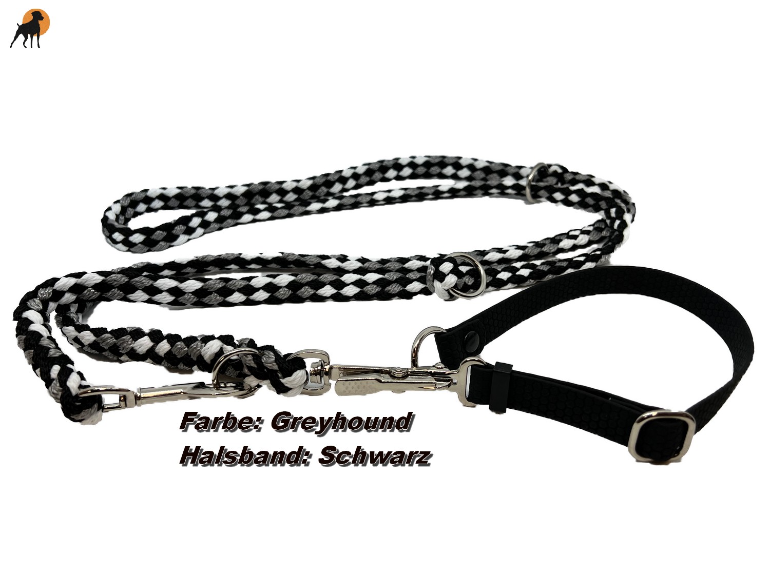 Polypropylentauwerk, doppelt geflochten, Ø ca. 12mm inklusive Halsband (ca. 20mm) an Jagdleinenhaken (Schnellverschluß), vernickelt - Runde Ringe, geschweißt und vernickelt - Gesamtlänge ca. 230 cm, 3-fach verstellbar. Halsband aus wasserabweisendem TPU Hexa Gurtband, komplett gummiert 20mm.