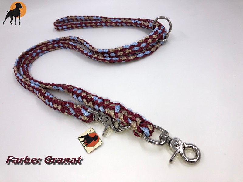 Unsere Bestseller-Doppelführleine wurde mit einem perfekten Detail überarbeitet und weiter entwickelt. Anstelle der Beiden eingeflochtenen Ringe kommt hier ein variabler, verschiebbarer Ring zum Einsatz, der alles Varianten der Doppelführleine zuläßt. Ob Umhängeleine, Führleine doppelt oder Führleine lang mit Handschlaufe - mit einem Handgriff lassen sich alle Optionen dieser Leine mühelos einstellen. 1a Qualität der Materialien sowie die perfekte Verarbeitung zeichnen diese Hundeleine aus. Das Material ist leicht und geschmeidig, extrem reißfest, wasserabweisend und pflegeleicht. Für den täglichen Gebrauch bestens geeignet.