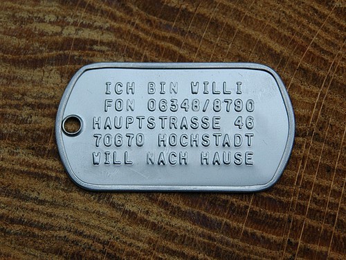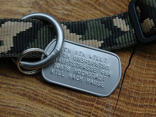 Neben Name des Hundes, Adresse und Telefonnummer haben Sie die Möglichkeit, bis max. 5 Zeilen mit je 16 Buchstaben (einschließlich Leerzeichen) zu Prägen. Ihrer Phantasie sind keine Grenzen gesetzt. Diese Marken eignen sich z.B. auch sehr gut als Kofferanhänger, am Schlüsselbund, ect.