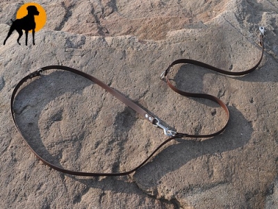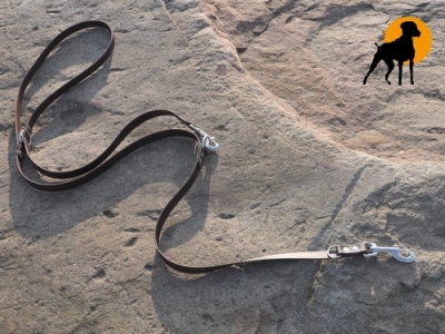 Unser Klassiker - jetzt auch in der längeren Version. Zusätzlich zur normalen Doppelführleine kann man bei dieser Leine noch per D-Ring eine Handschlaufe an einem Leinenende eine Handschlaufe machen und hat so eine verlängerte Führleine.