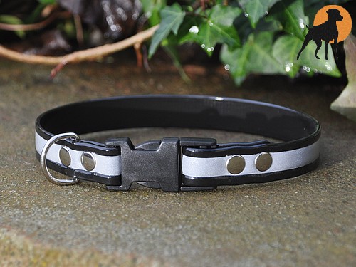 Maß-Halsband aus Biothane Reflect mit Klickverschluß aus PVC. Ideales Handling.