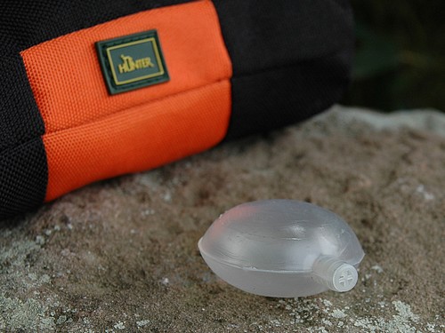 Optimale Ergänzung zu diesem Futterdummy ist der "Queeker" (Bild 3). Dieser wird mit in den Dummy gepackt und quietscht, wenn der Hund darauf beißt. Fördert vor allem bei Welpen den Spieltrieb.