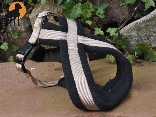 Das Premium Hundegeschirr ist stufenlos verstellbar und mit schwarzem Vlies gepolstert. Es bietet einen hohen Tragekomfort für Ihren Hund.
