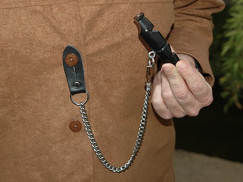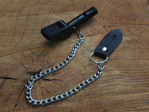 Zum einhängen der Pfeife ist ein Simplex-Sicherheitshaken am Ende der Kette. Das Pfeifenkettchen wird per Lederöse an einem Knopf der Jacke bzw. am Hemd befestigt und ist so immer griffbereit.