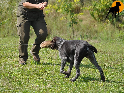 Nachdem der Erdanker im Boden sicher befestigt ist, wird das Gummiseil angezogen und im richtigen Moment losgelassen. Das Dummy wird über dem Platz katapultiert und sorgt für Ablenkung beim Hund.