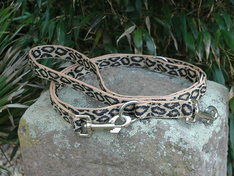 Leine aus strapazierfähigem weichem Polypropylen, mit 3 nichtrostenden Edelstahlringen und 2 stabilen, vernickelten Karabinerhaken, Design eingewebt, beige, schokobraun, schwarz, von Hand doppelt genäht.