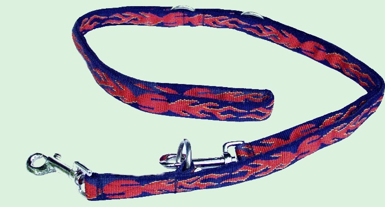 Leine aus strapazierfähigem weichen Polyamid, mit 3 nichtrostenden Edelstahlringen und 2 stabilen, vernickelten Karabinerhaken, Design eingewebt, nachtblau-knallrot-sonnengelb, von Hand doppelt genäht.Pimp your dog!
