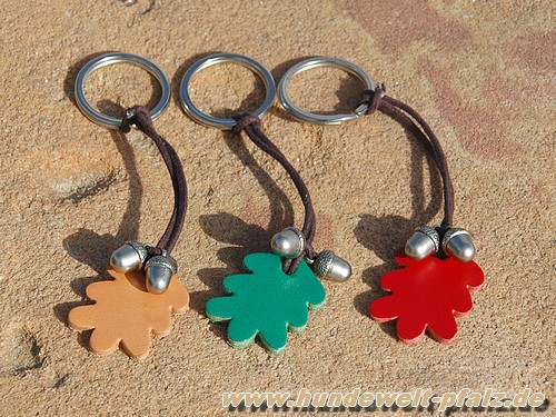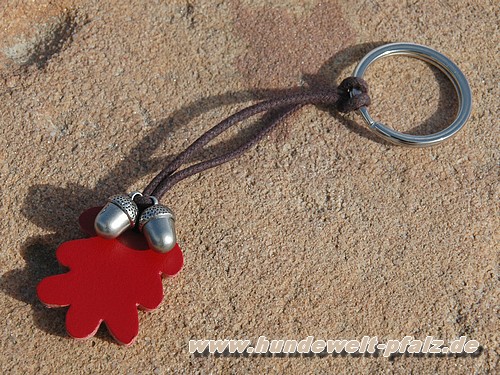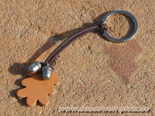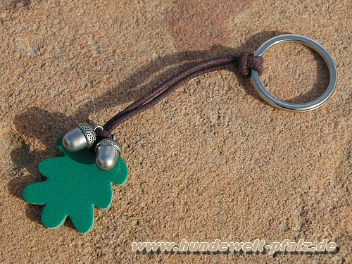 Aufwendiger Schmuckanhänger in Form eines Eichenblattes aus Leder mit 2 Eicheln aus Metall.