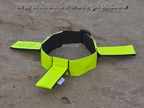 Die Halsungen sind verstellbar durch ein elastisches Band. Dieses ermöglicht dem Hund ebenfalls, daß er sich das Reflexband selbst abstreifen kann, wenn er z.B. im Gestrüpp o.ä. hängenbleibt.