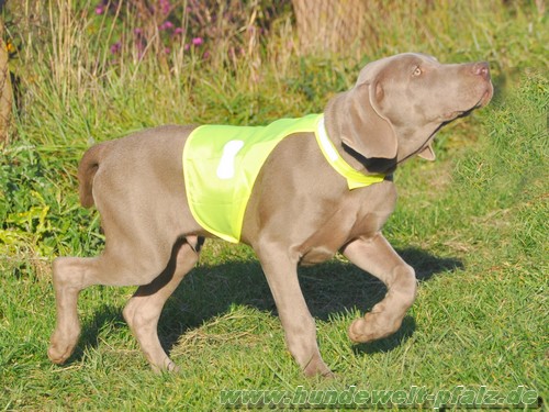 Sehr gut sichtbare Sicherheitsweste für Hunde. Einfach anzuziehen und verstellbar durch Klettverschlüsse.