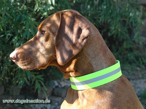 Zum einen verringerte diese Halsung die Gefahr, daß der Hund von einem ansitzenden Jäger mit Wild verwechselt wird, zum anderen reflektieren diese Halsungen hervorragend das Licht herankommender Fahrzeuge. Außerdem kann man diese Halsungen mit der Telefon- oder Handynummer beschriften, daß sofort reagiert werden kann, falls der Hund mal bei der Jagd oder beim Spaziergang abhanden kommt und von jemandem gefunden wird.