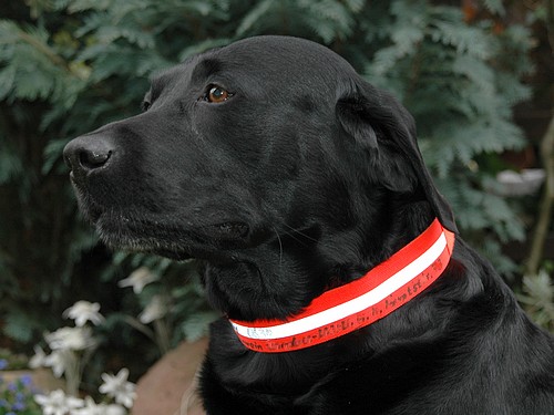Zum einen verringerte diese Halsung die Gefahr, daß der Hund von einem ansitzenden Jäger mit Wild verwechselt wird, zum anderen reflektieren diese Halsungen hervorragend das Licht herankommender Fahrzeuge. Außerdem kann man diese Halsungen mit der Telefon- oder Handynummer beschriften, daß sofort reagiert werden kann, falls der Hund mal bei der Jagd oder beim Spaziergang abhanden kommt und von jemandem gefunden wird.