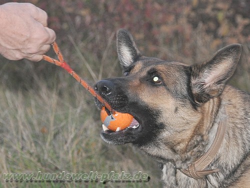 Hier wird das Spielseil mit einem Vollgummispielzeug verbunden. Der Ball kann gut weggeschleudert werden und die Hände bleiben sauber.