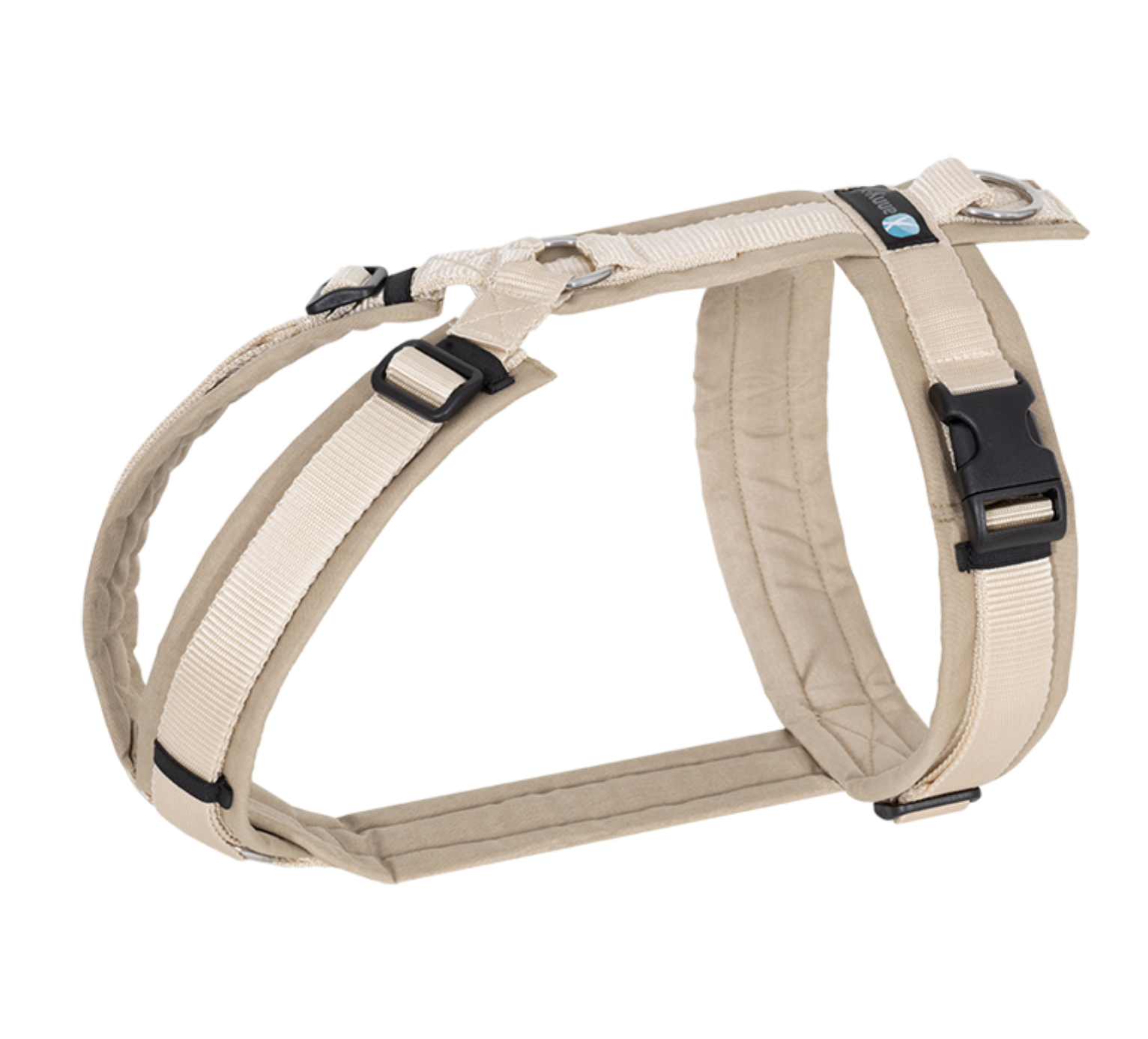 Die umlaufenden Gurte im Brustbereich bilden dank des langen Unterbruststegs einen bewegungsfreundlichen Abstand zu den Vorderbeinen, so dass die Achseln geschont werden. Das Gurtband ist in der kleinsten Einstellung komplett mit luftdurchlässigen Schaumstoff gepolstert und dieser wiederum ist mit Cordura (hoch abriebfestes Material) eingefasst.
