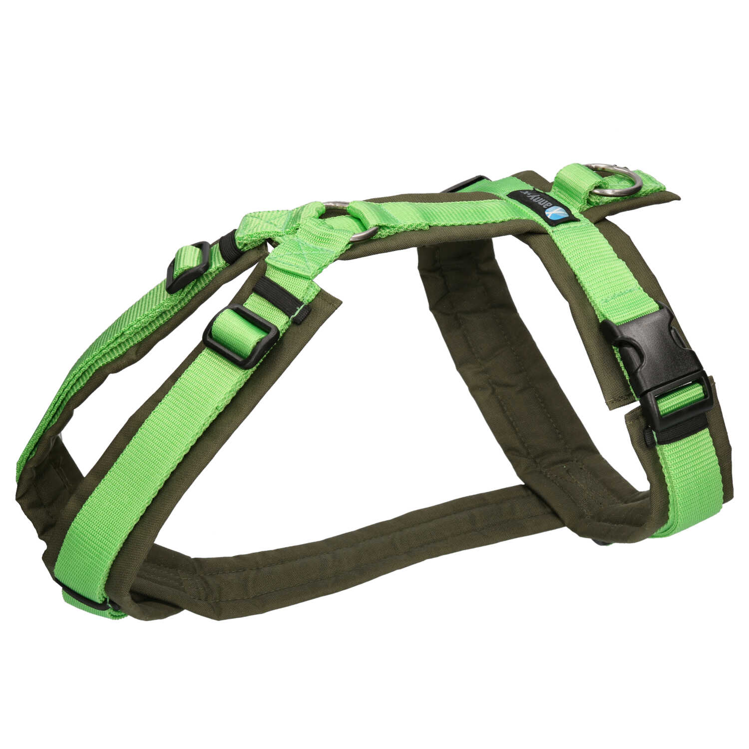 Die umlaufenden Gurte im Brustbereich bilden dank des langen Unterbruststegs einen bewegungsfreundlichen Abstand zu den Vorderbeinen, so dass die Achseln geschont werden. Das Gurtband ist in der kleinsten Einstellung komplett mit luftdurchlässigen Schaumstoff gepolstert und dieser wiederum ist mit Cordura (hoch abriebfestes Material) eingefasst.