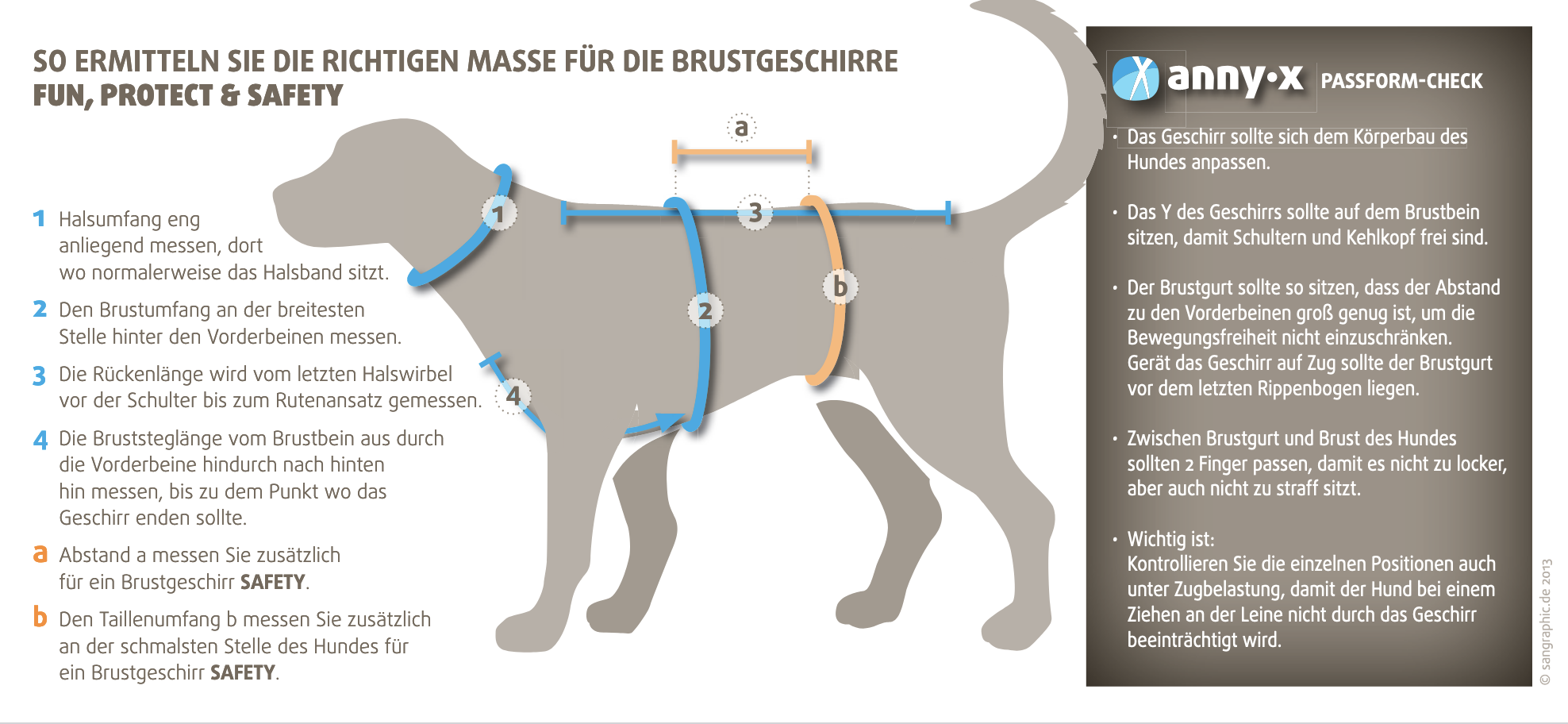 Entscheidend beim Messen ist die Länge des Bruststegs. Brust und Bauch lassen sich dann stufenlos einstellen. Die Länge des Bruststegs wird ganz einfach gemessen: Lege das Maßband am Beginn des Brustbeines an und führe es zwischen den Vorderbeinen hindurch nach hinten bis zu letzten Rippenbogen. Der Bruststeg sollte hinter der breitesten Stelle des Brustkorbes und vor dem letzten Rippenbogen enden.