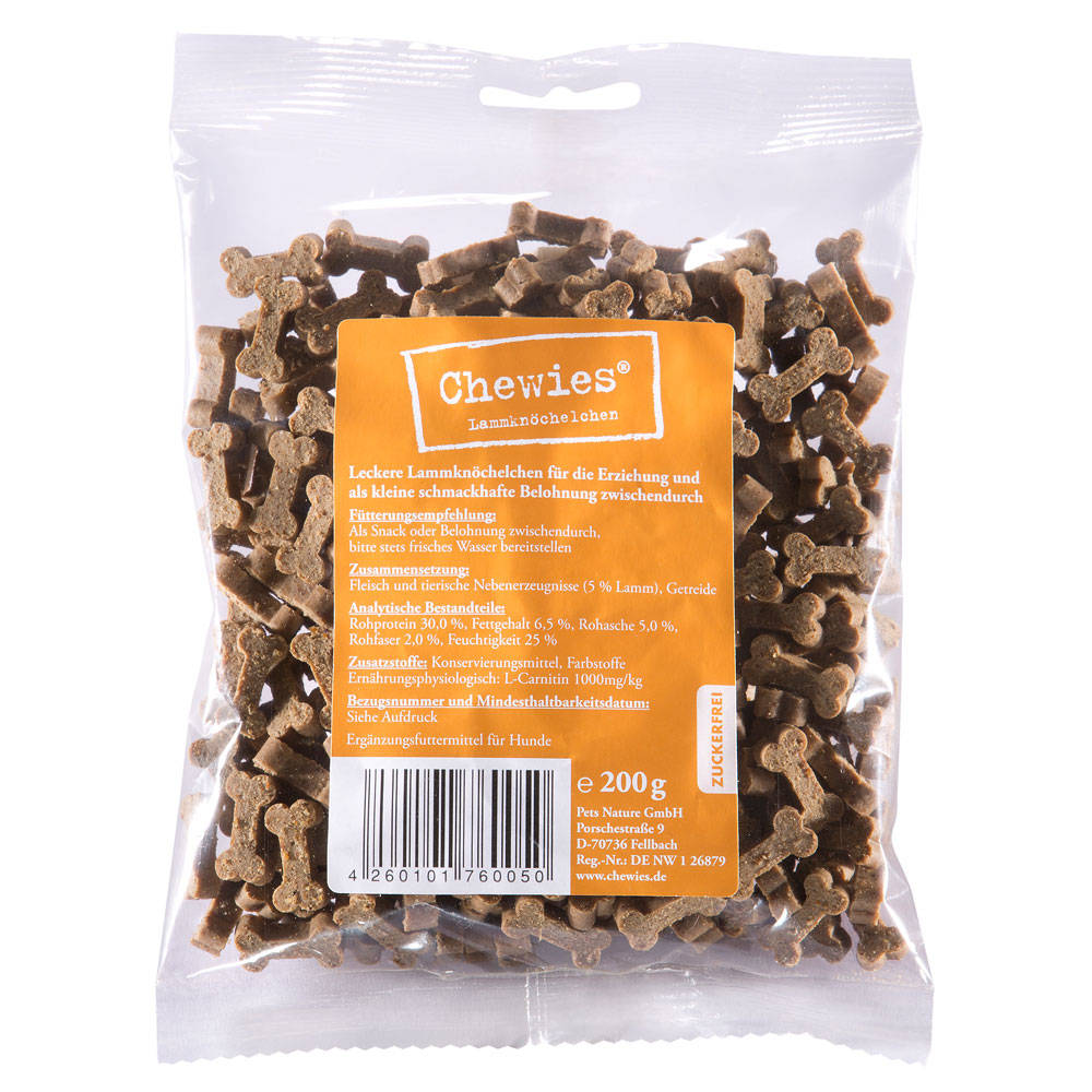 Chewies Training MAXI Lammknöchelchen sind schmackhafte Trainingsleckerli und bei Hunden und Katzen sehr beliebt! Aufgrund ihrer hohen Akzeptanz und ihrer handlichen Größe sind Chewies auch für unterwegs ein ideales Leckerli. Hunde und Katzen sind mit diesem leckeren Snack gut zu motivieren. Chewies sind Belohnung pur für Ihren Liebling! Chewies - 100 % Hund!