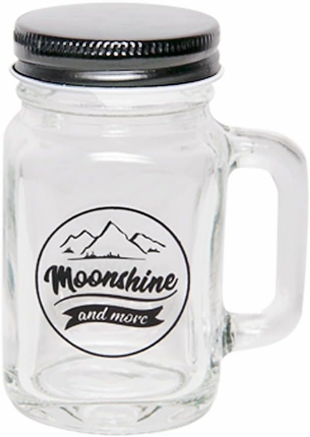 - UNGEWÖHNLICHES DESIGN: Dank des Henkels ist das kleine Trinkglas immer fest im Griff und die Schraubdeckel machen den handlichen Mini-Glaskrug so praktisch. Da die Form des Glases einem klassischem amerikanischen Marmeladenglas in Miniaturform ähnelt, wurde es noch mit einem Aufdruck und dem passenden Aufschrift „Moonshine & More „ versehen.