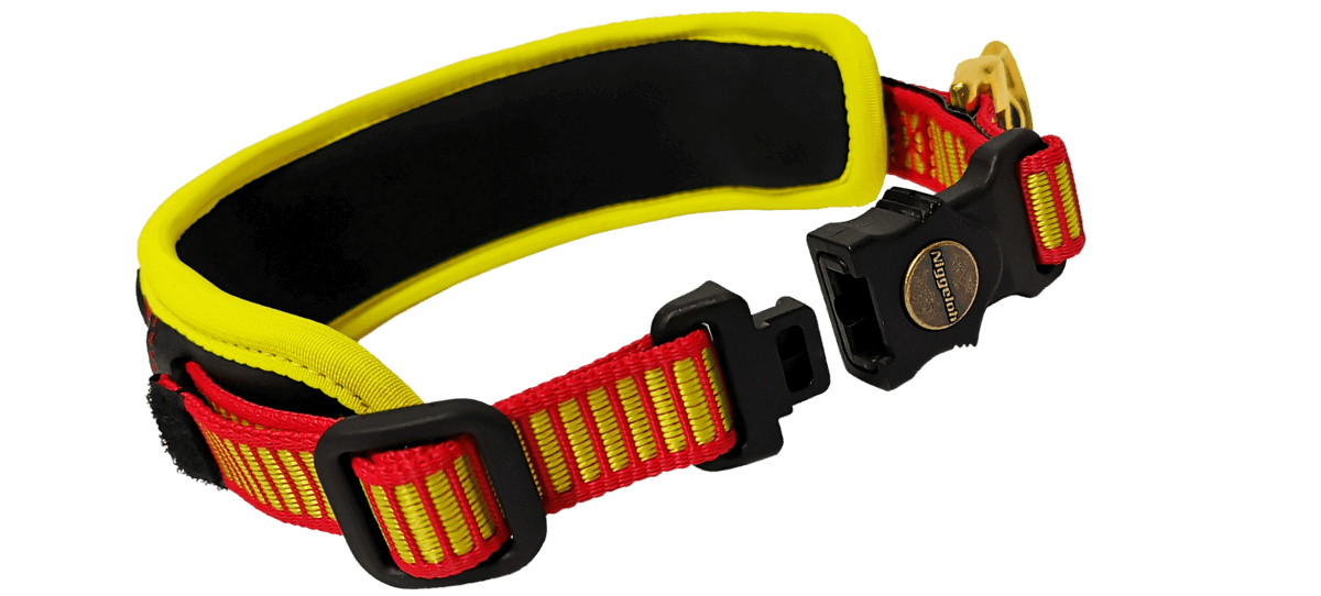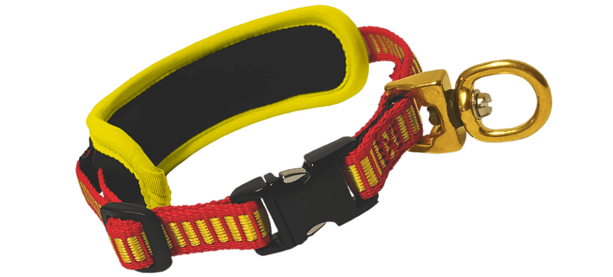 - Ein Zug (Gr. S & M) bzw. Druck (Gr. XS) am Schnellverschluss öffnet die Halsung und gibt den Hund frei. OHNE ihn zu stören!