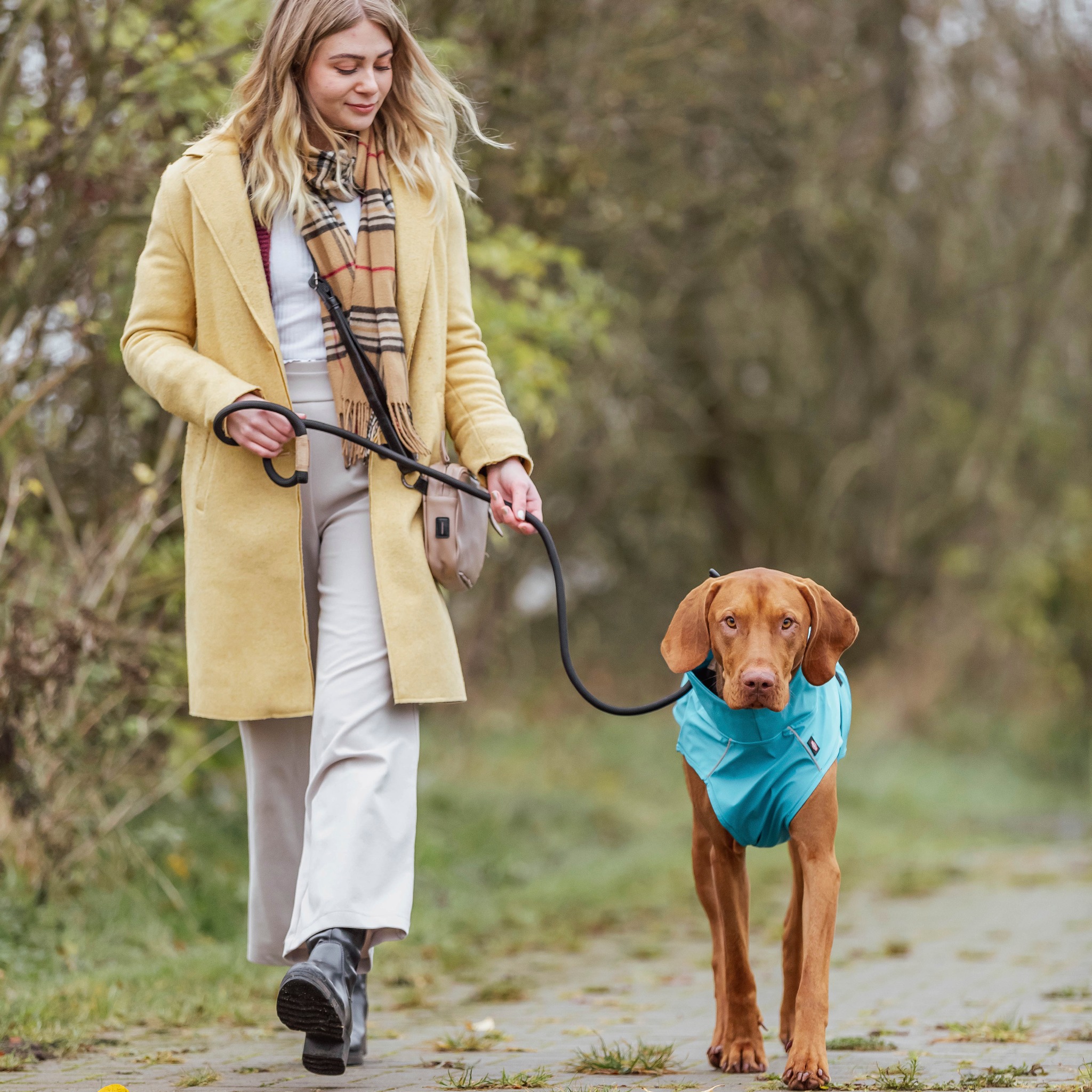 - mit zwei wasserdichten Reißverschlüssen zum Anleinen an Halsband bzw. Geschirr