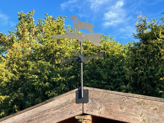 Wetterfahne aus pulverbeschichtetem Stahlblech mit Silhouette des Springer-Spaniels.