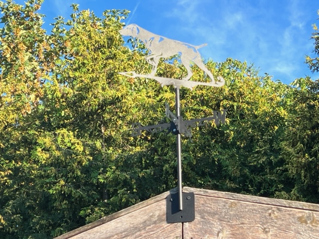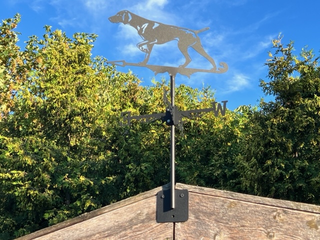 Wetterfahne aus pulverbeschichtetem Stahlblech mit Silhouette des Weimaraners.